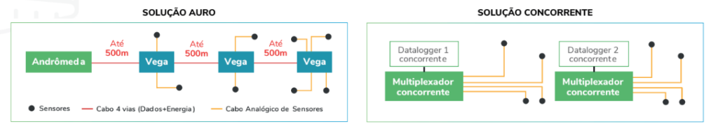 O Datalogger Vega é capaz de realizar a leitura de até 16 sensores sem a necessidade de conversores adicionais. Sua interface de comunicação RS-485 permite a comunicação com o Concentrador Andrômeda a uma distância superior a 500 metros.